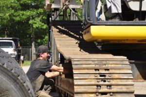 The guys at EER has been busy this week, taking on a job with the monster excavator that is the Kobelco SK350 they have been working on the tracks for it by use of our premier Track Press. Starting by using the excavator itself to very carefully maneuver it up onto place holders while the new tracks were pressed with aid of our brand new WTC Trackmaster TM200 Track Press machine. Once done pressing the new tracks with our brand new state of the art Track Press machine we had to then place them back onto the 36 foot long, 11 foot high and 80,000lbs machine. Using the boom and bucket to direct and pivot the excavator while the new tracks were put on very carefully using various skill and equipment in the process, the guys finally did it and with only four people needed. The guys also had to compress a tension spring by 12 inches which they accomplished by using our one-of-a-kind in house developed compression mechanism.