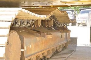 Kobelco SK350 excavator track replacement, tension spring compression & track refurbishment.
